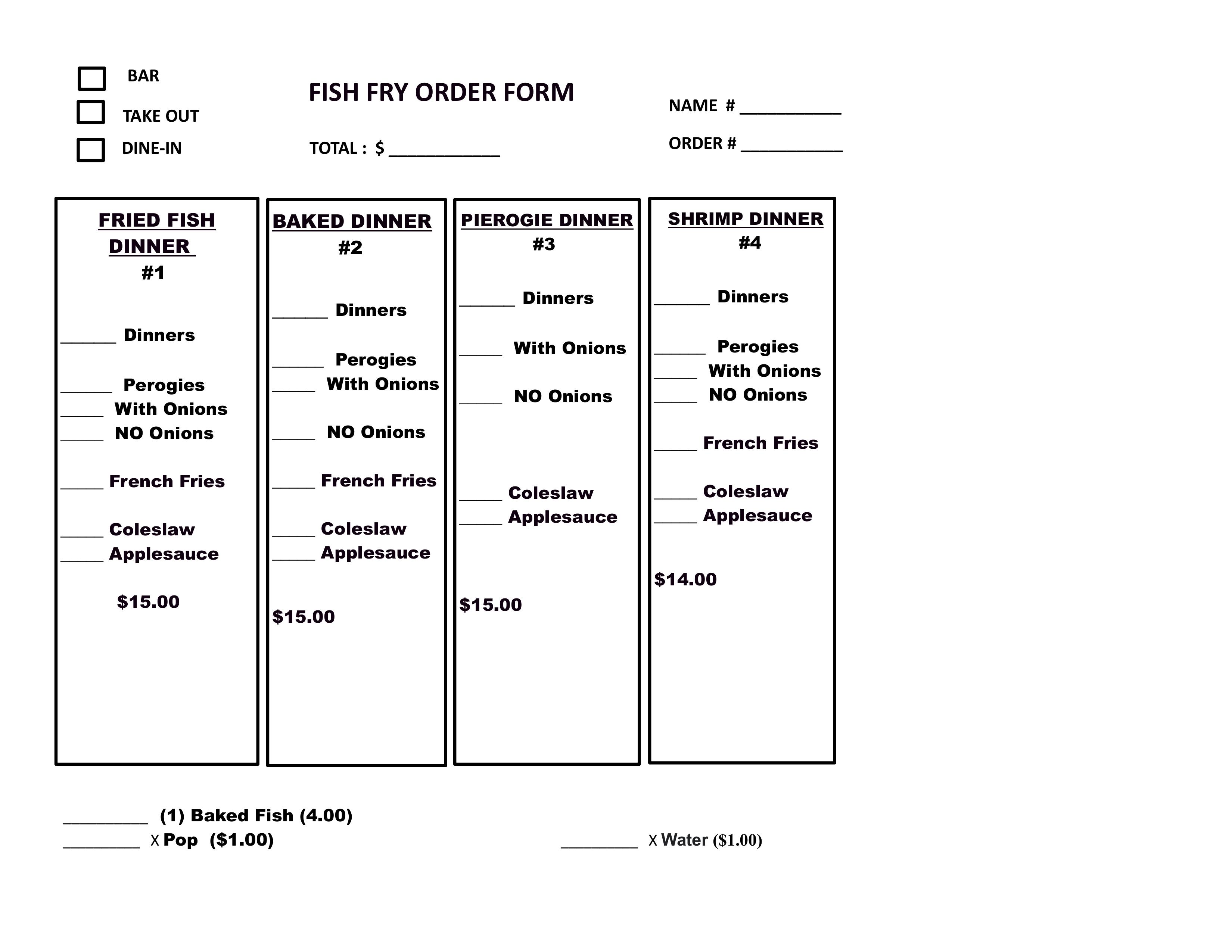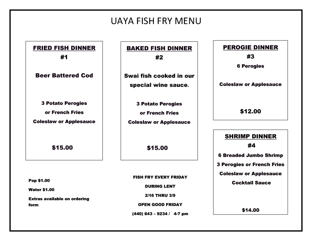 Due to the Notice from the Governor, we will have the Fish Fry with "To Go dinners only" until further notice. We are still making perogies for Friday pickup. Place your orders early. Pickup hours on Friday During Lent from 4:00pm to 7:30pm